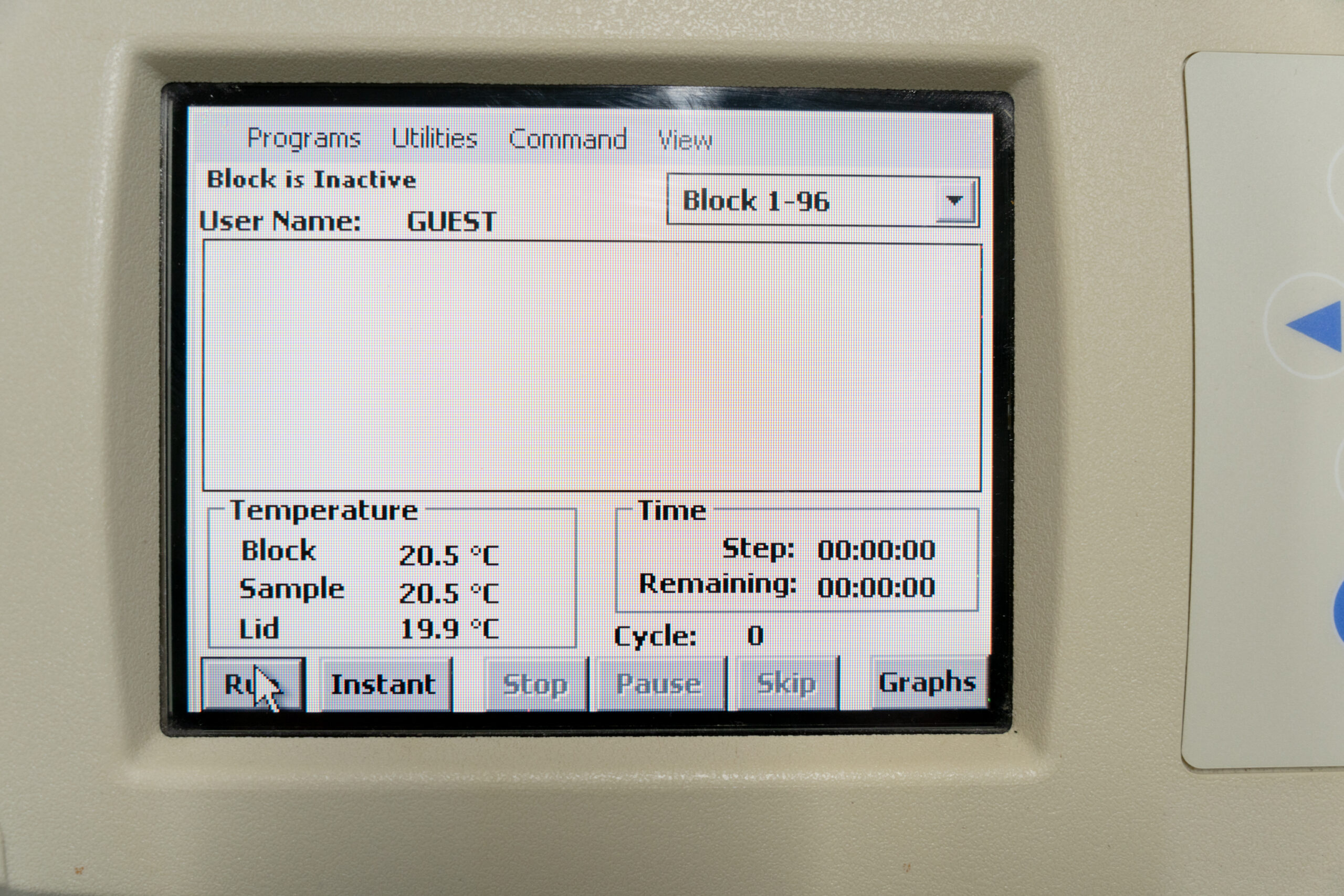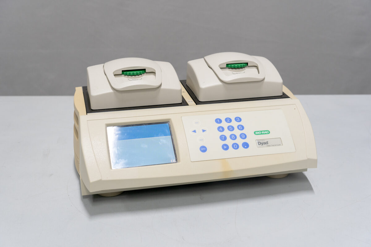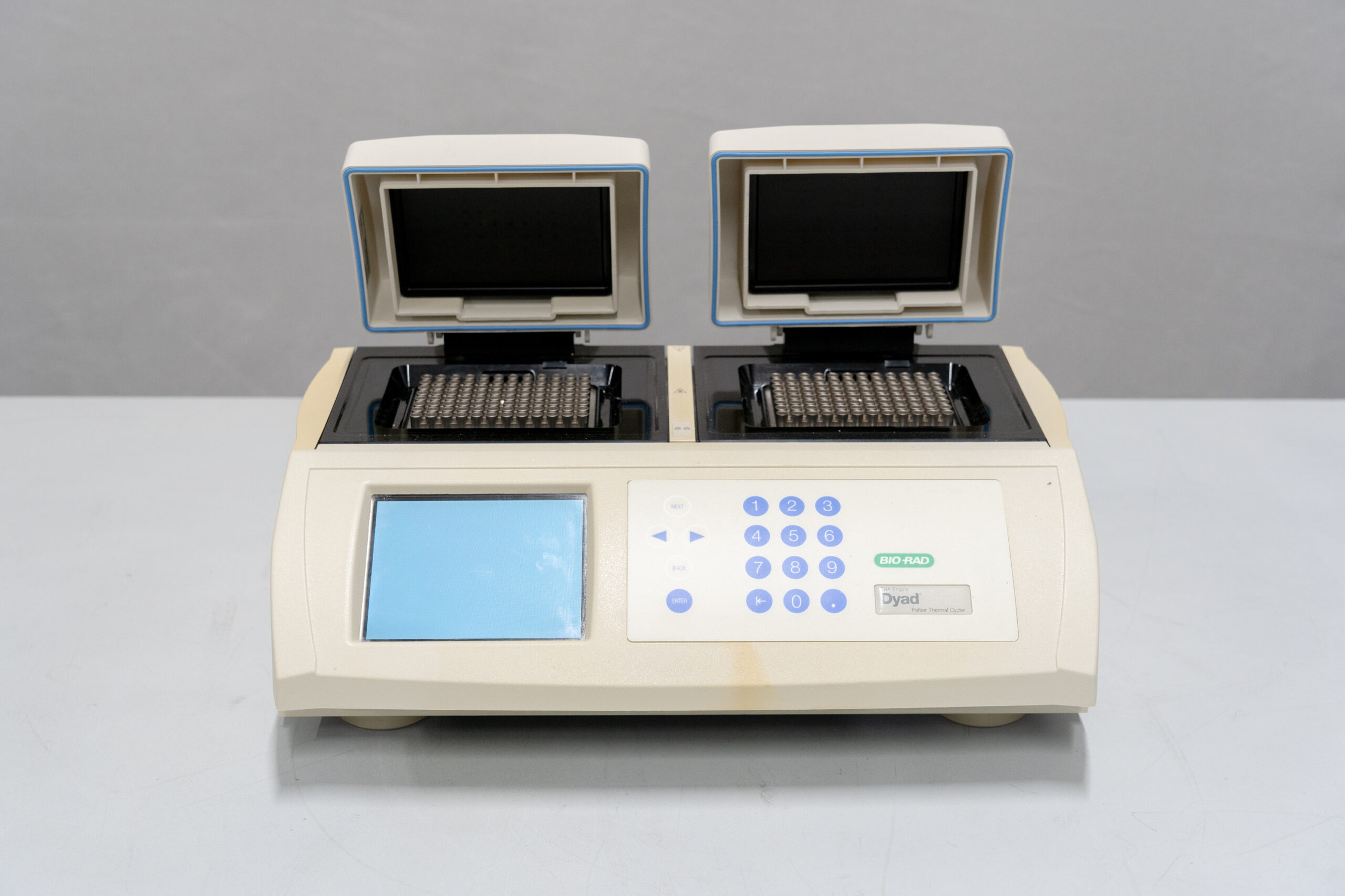 The Bio Rad DNA Engine Dyad Thermal Cycler with two bays features a high-density graphical interface and a colour display. Includes computer mouse and English manual.