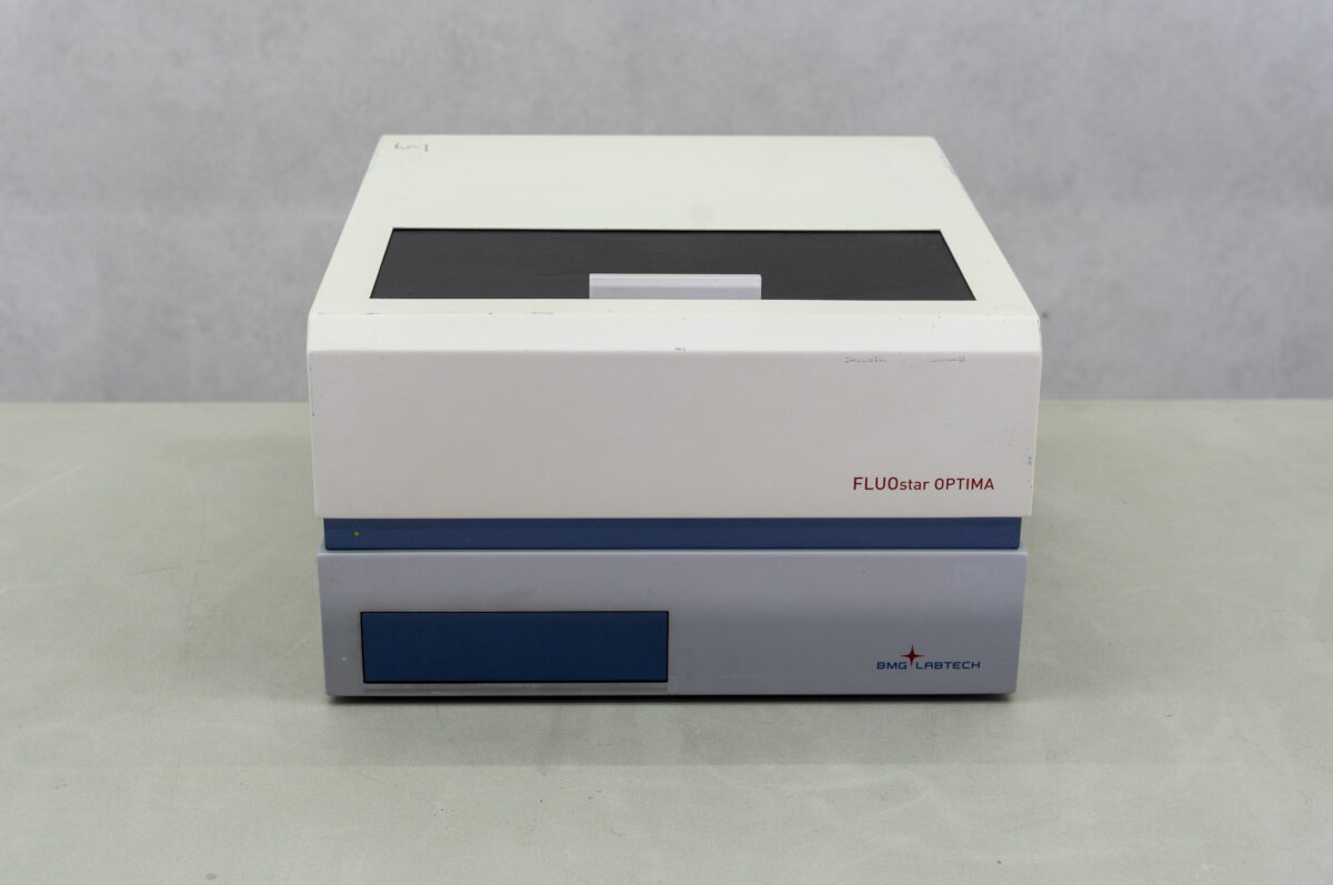 Used microplate reader from BMG, type FLUOstar OPTIMA. This reader measures the fluorescence and light absorbance of samples in 96-well plates.