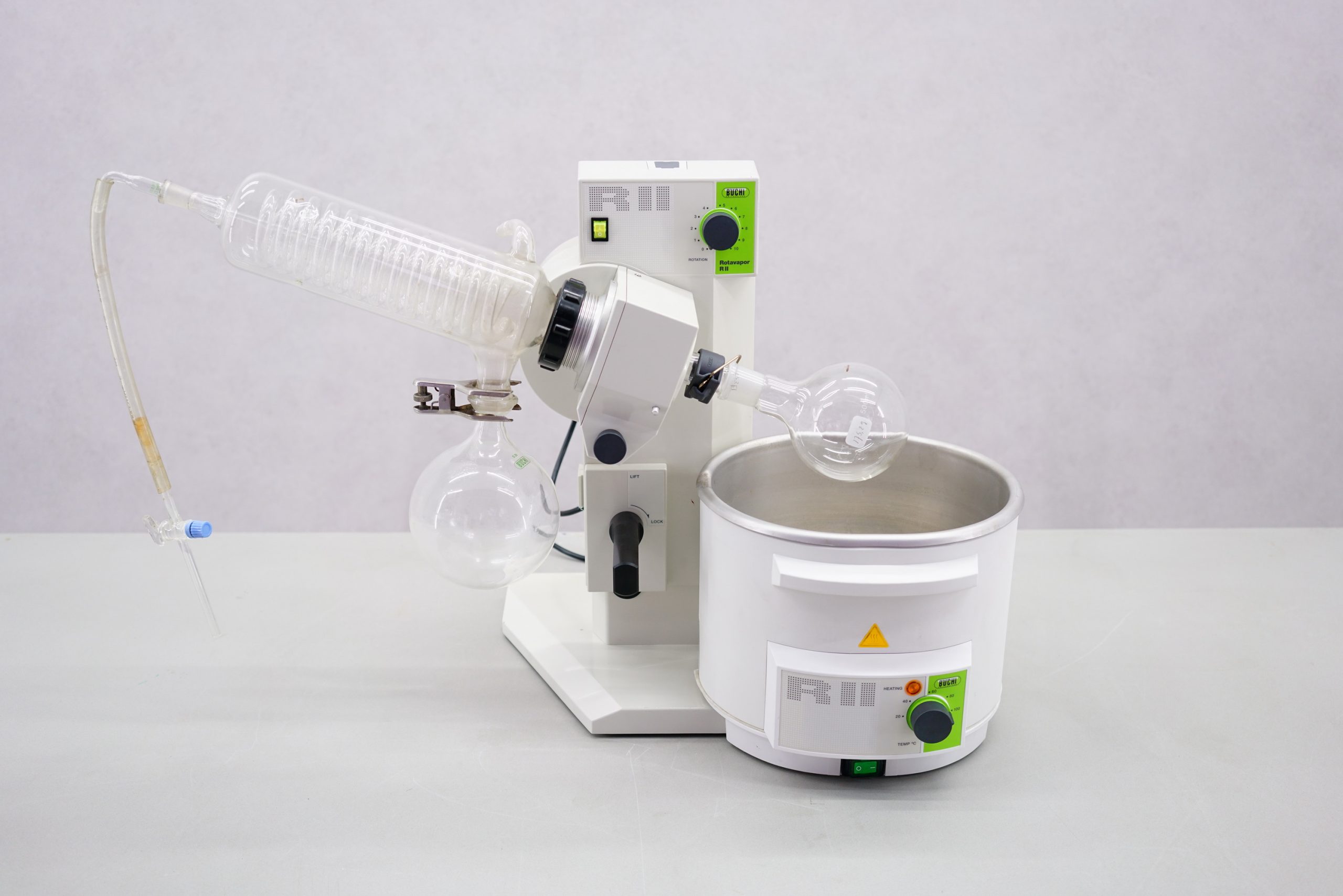 The Rotavapor of the Buchi type R-II brand is particularly suitable for distilling low-boiling solvents, evaporating solvents and suspensions and for (re) crystallizing liquids in the rotary evaporating flask. The distillations can be carried out under vacuum and atmospheric pressure. Furthermore, this rotavapor does not require supply of cooling water.