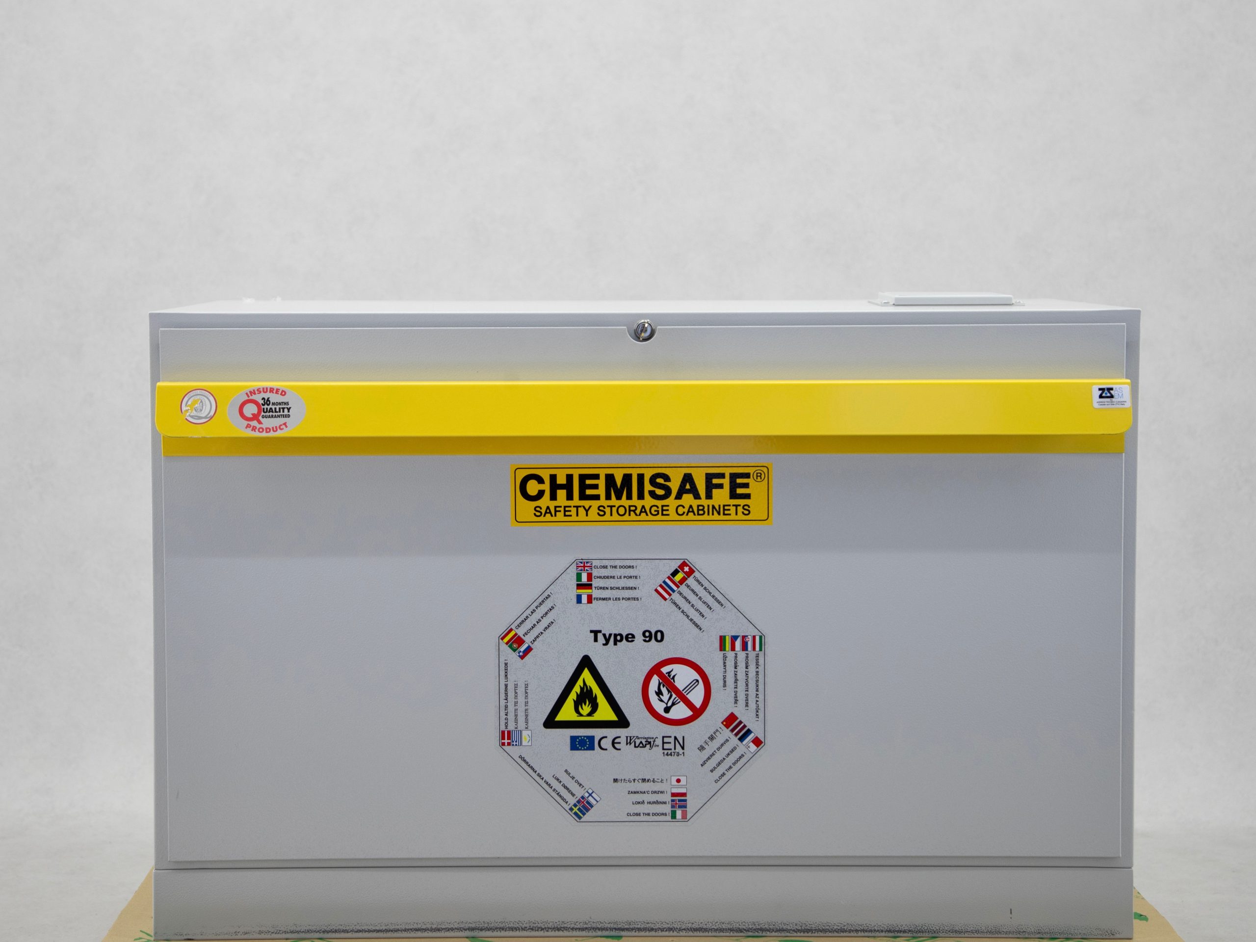 The fire-resistant safety cabinet of the brand Chemisafe type T90 is designed for safe storage of flammable substances.