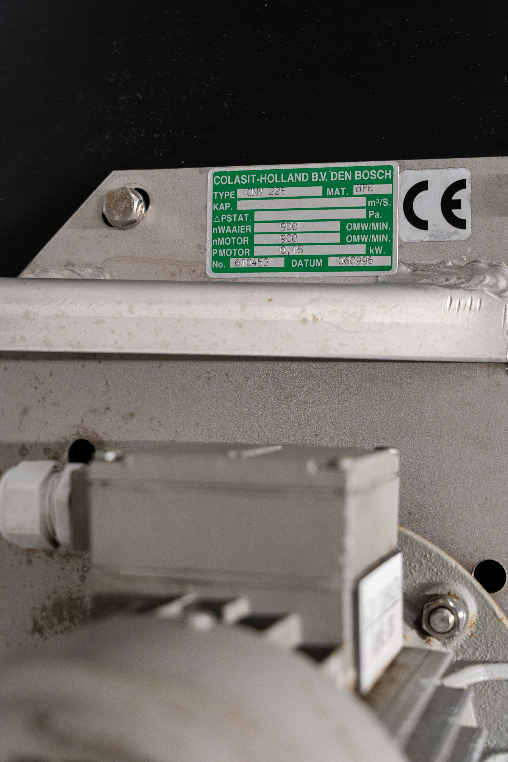 The Colasit CMV 225 radial fan is a robust, plastic centrifugal fan designed for the safe and efficient extraction of chemically aggressive air, gases, or vapors—for example, in laboratories, chemical plants, or industrial ventilation systems.