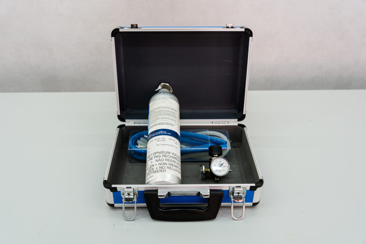 An Euro SCIOS span control set to periodically test flue gas analyzers for SCIOS purposes. The Flow on demand regulator provides exactly the right amount of gas for the flue gas analyzer, so no gas is lost.