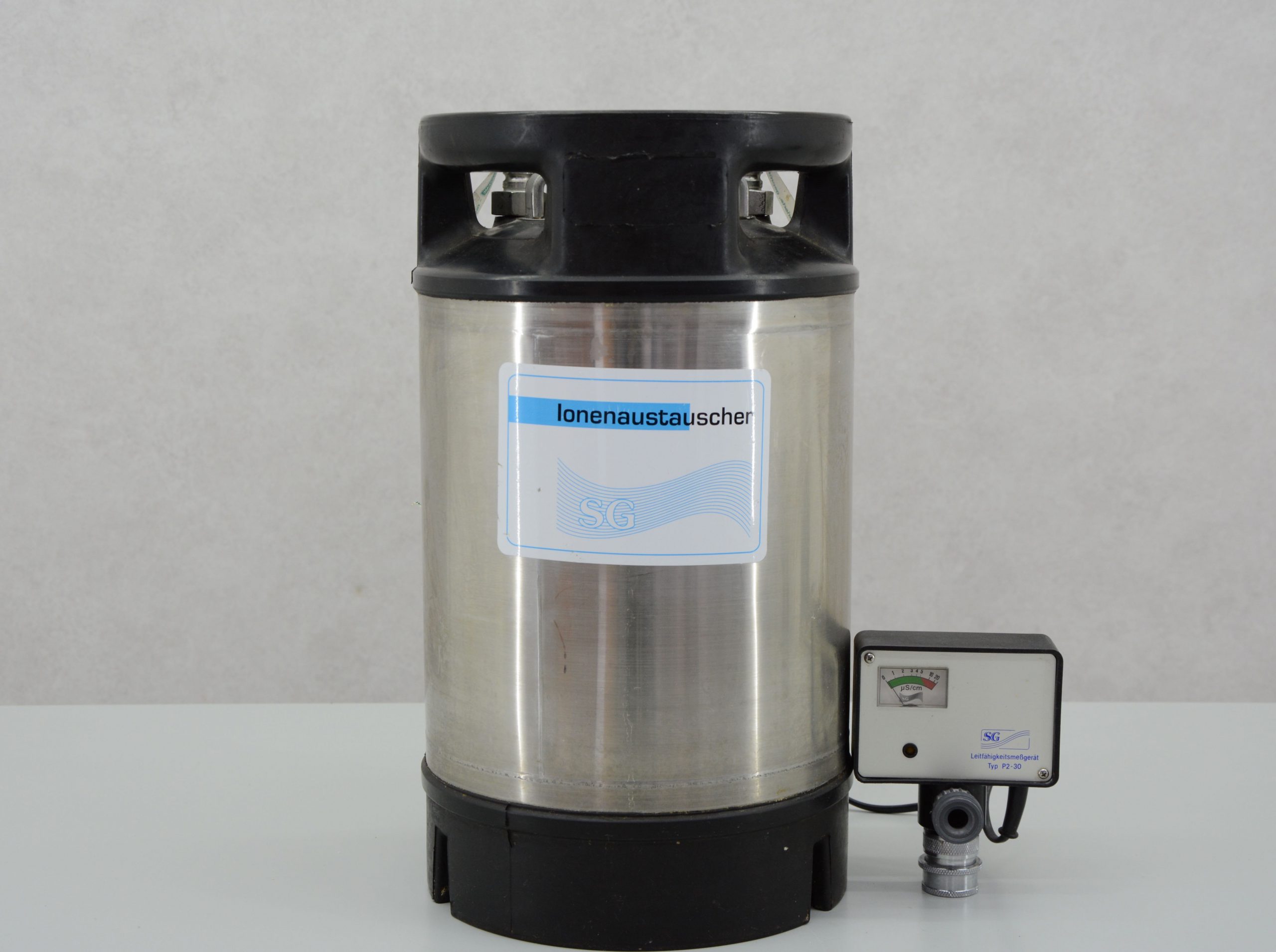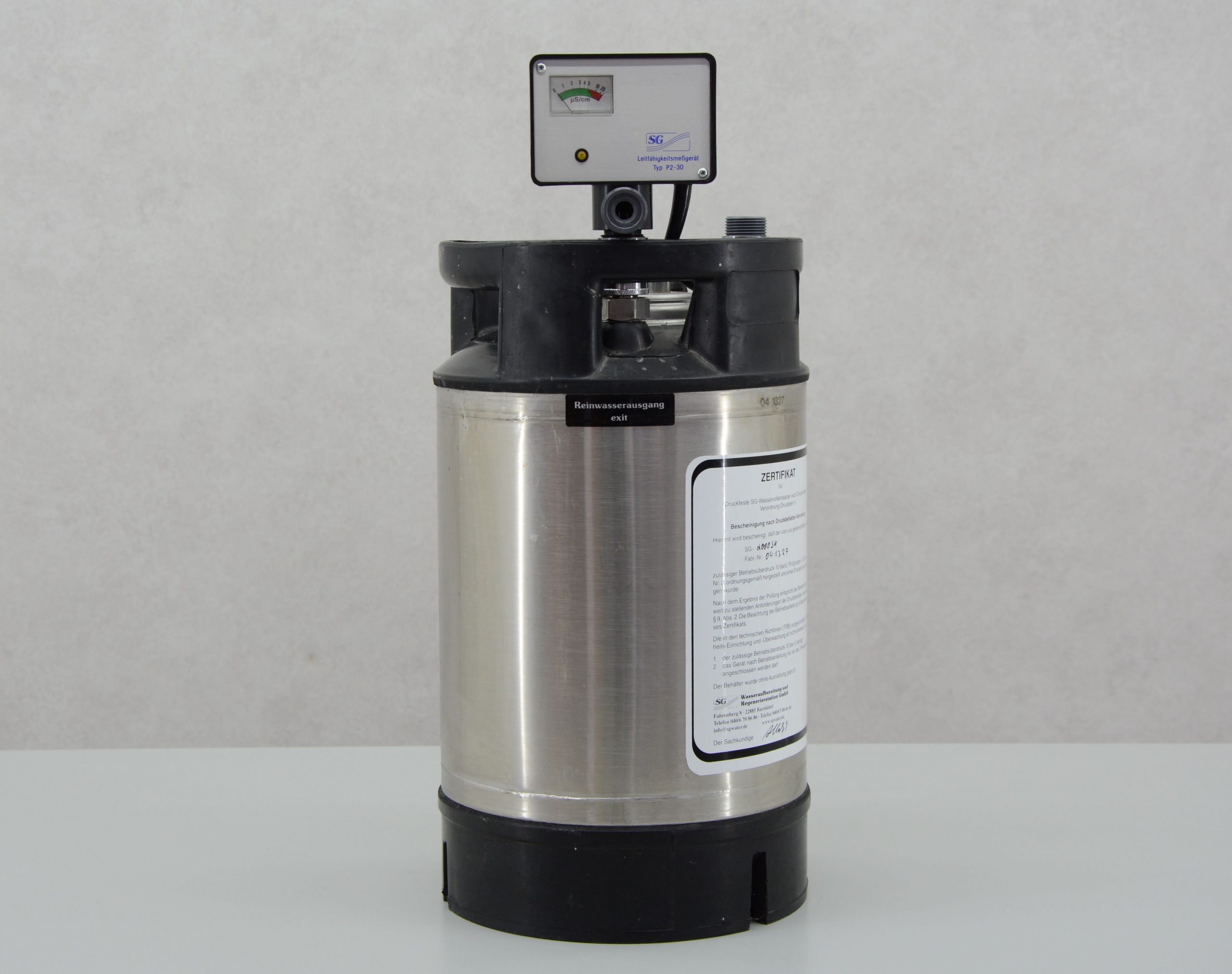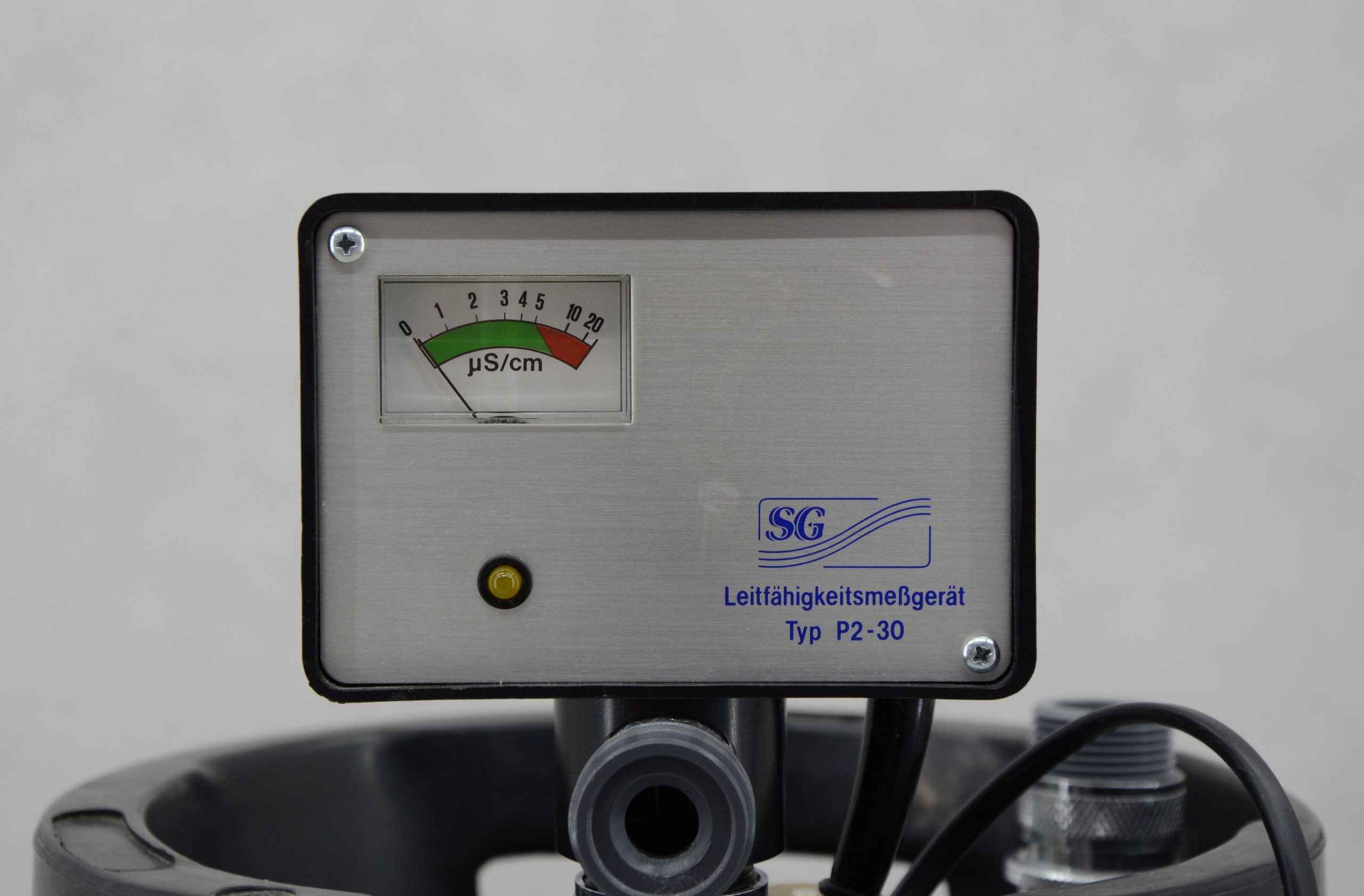 The demi water cartridges of the brand Evoqua type SG-2000 SK are ideal for pure water supply for ultrapure water systems, laboratories washing machines, autoclaves and climate chambers. Two of the three demineralised water cartridges have been regenerated and fitted with a conductivity meter.