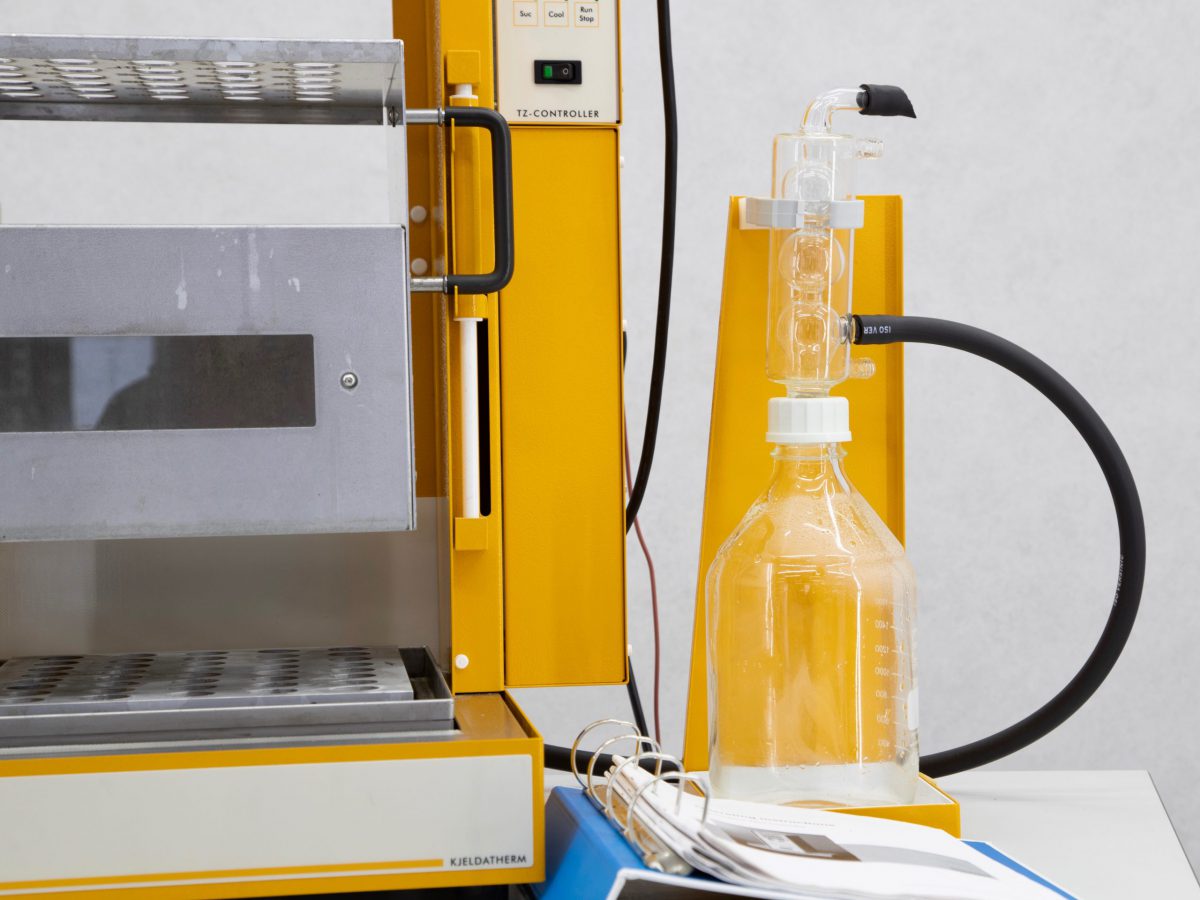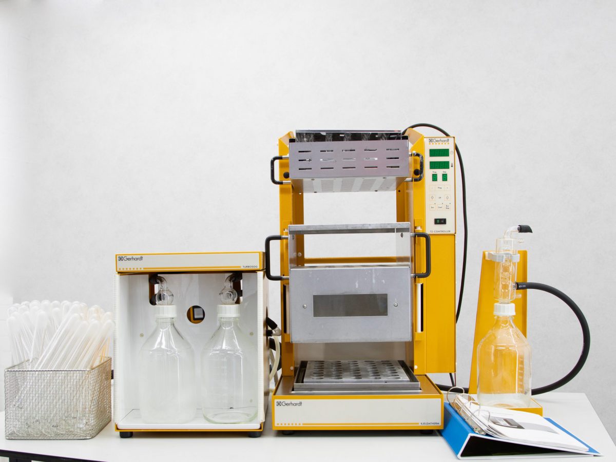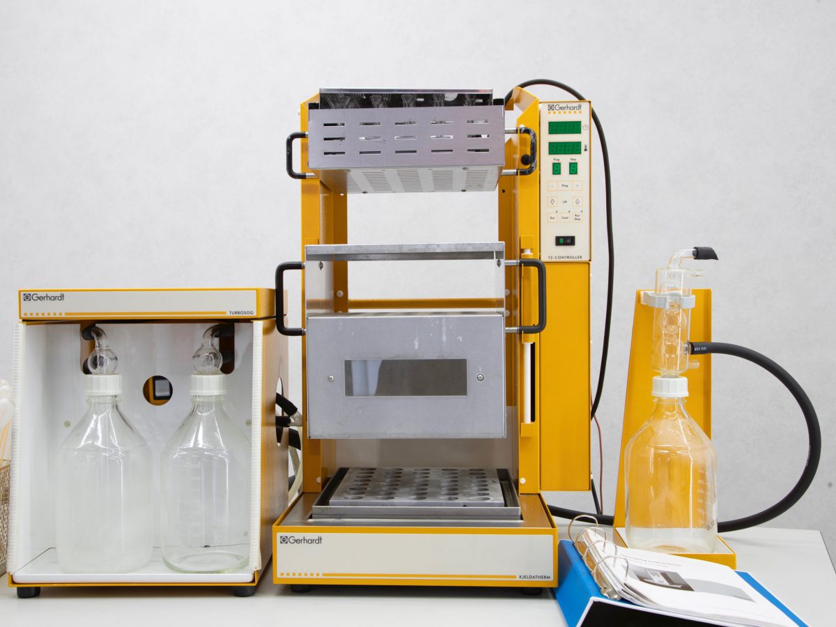 The digestion unit of the brand Gerhardt type Kjeldatherm KB40S is ideally suited for determining the nitrogen and protein amount in solid and pasty substances. The Gerhardt Kjeldatherm KB40S will be delivered including T2 controllers, block digestion unit and cooling unit 2KE (volume 2000 mL). The Turbosog is also included for the extraction of inorganic gases up to 3200 L/h.