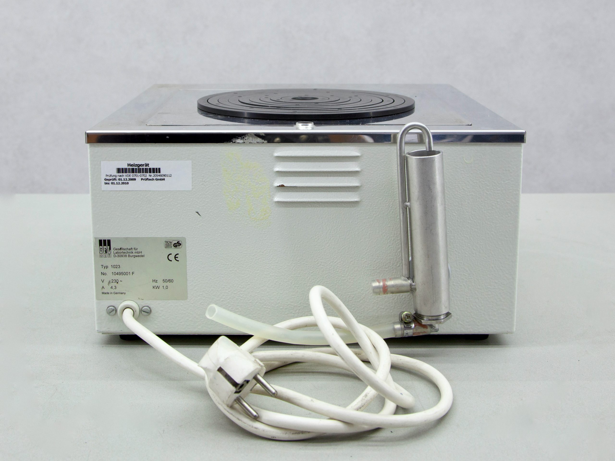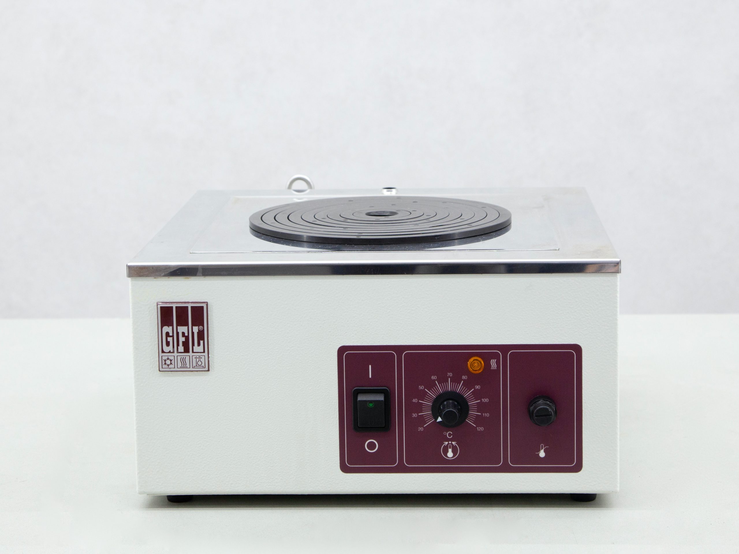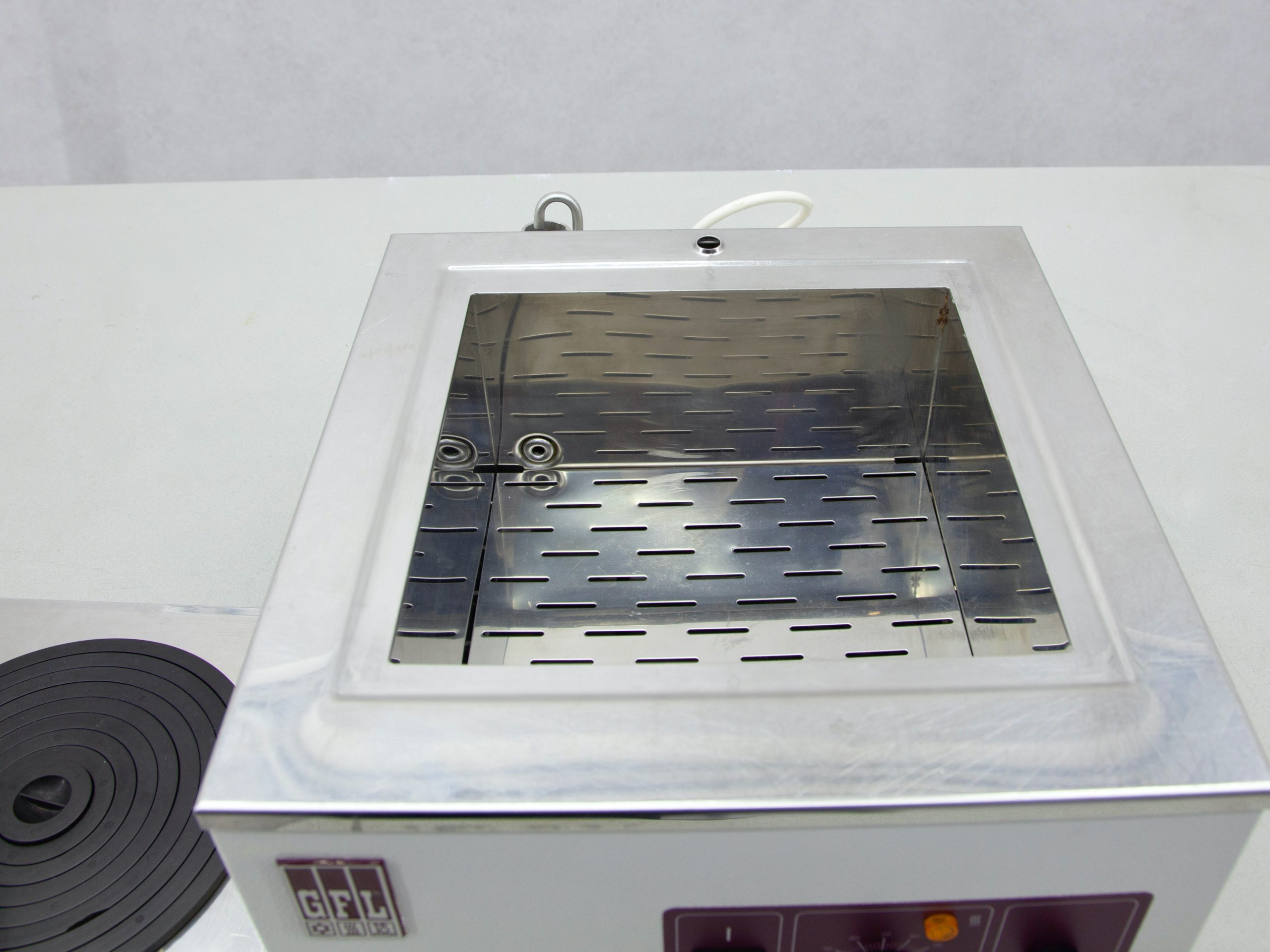 GFL water bath, type 1023. The water bath with lid includes bearing rings and automatic overflow / filling connection. The water bath has an analog thermostat.