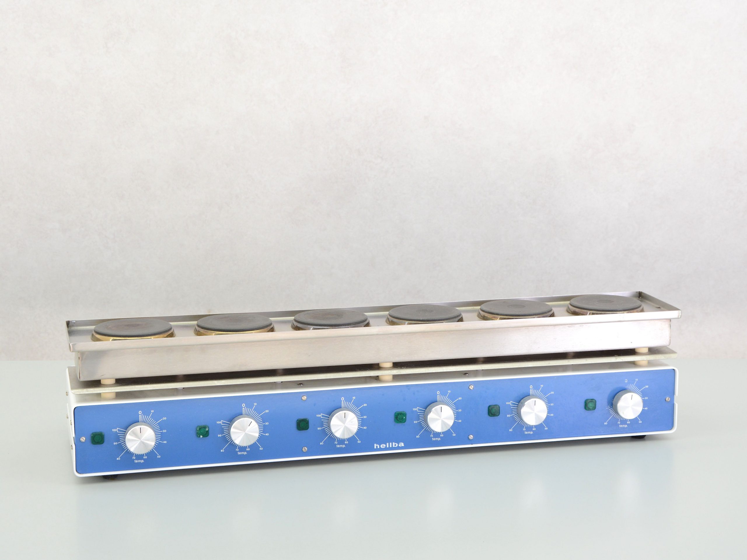 The six heating plates of the brand Helba type OS6 are suitable for heating and keeping different materials at temperature. Each heating plate has its own rotary knob for temperature control.