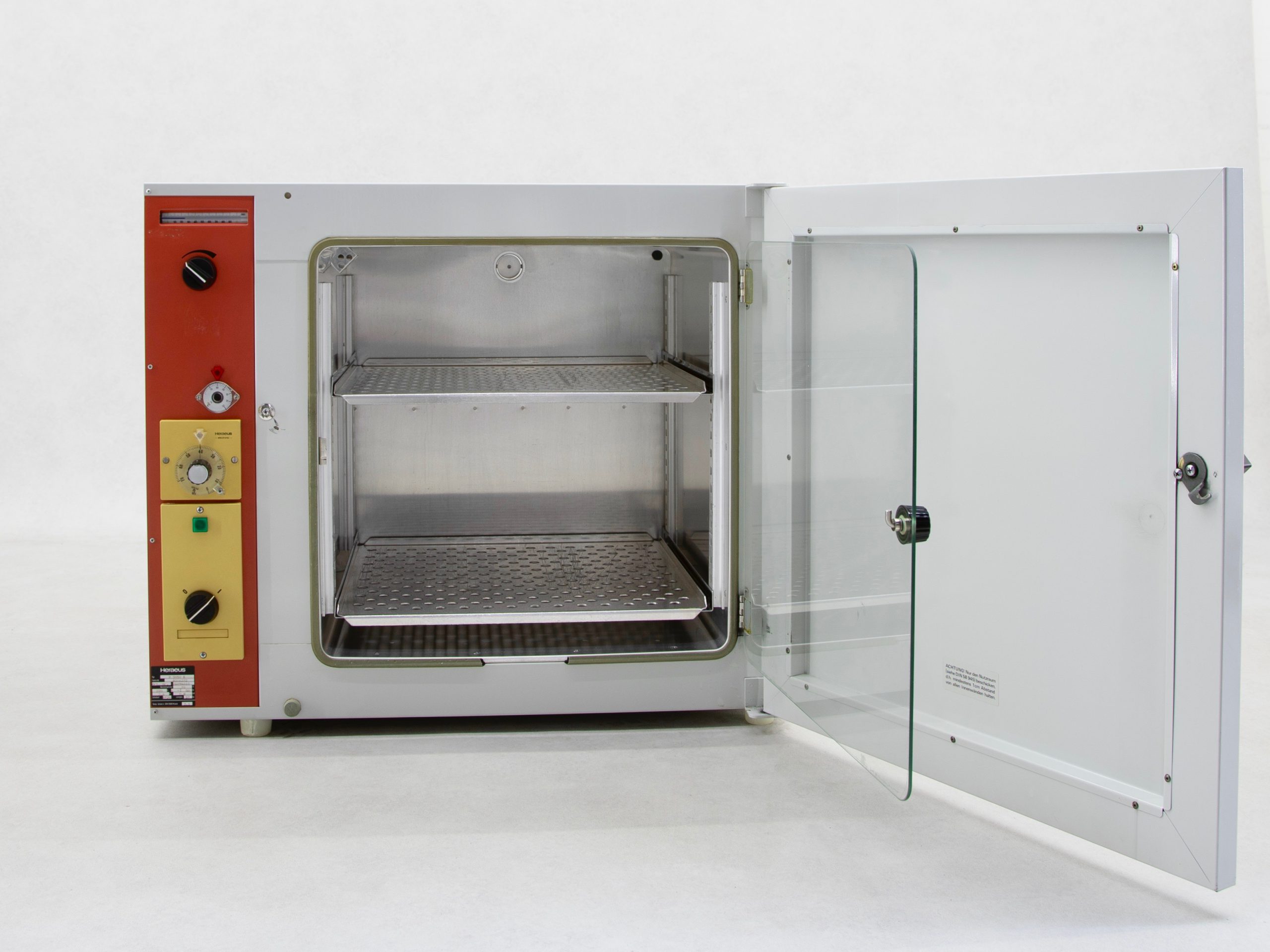 The incubator of the brand Heraeus type B5050E is designed for biochemical studies, haematological studies, microbiological studies, stability tests, quality controls and for the cultivation of bacteria. Furthermore, this incubator is equipped with two shelves.