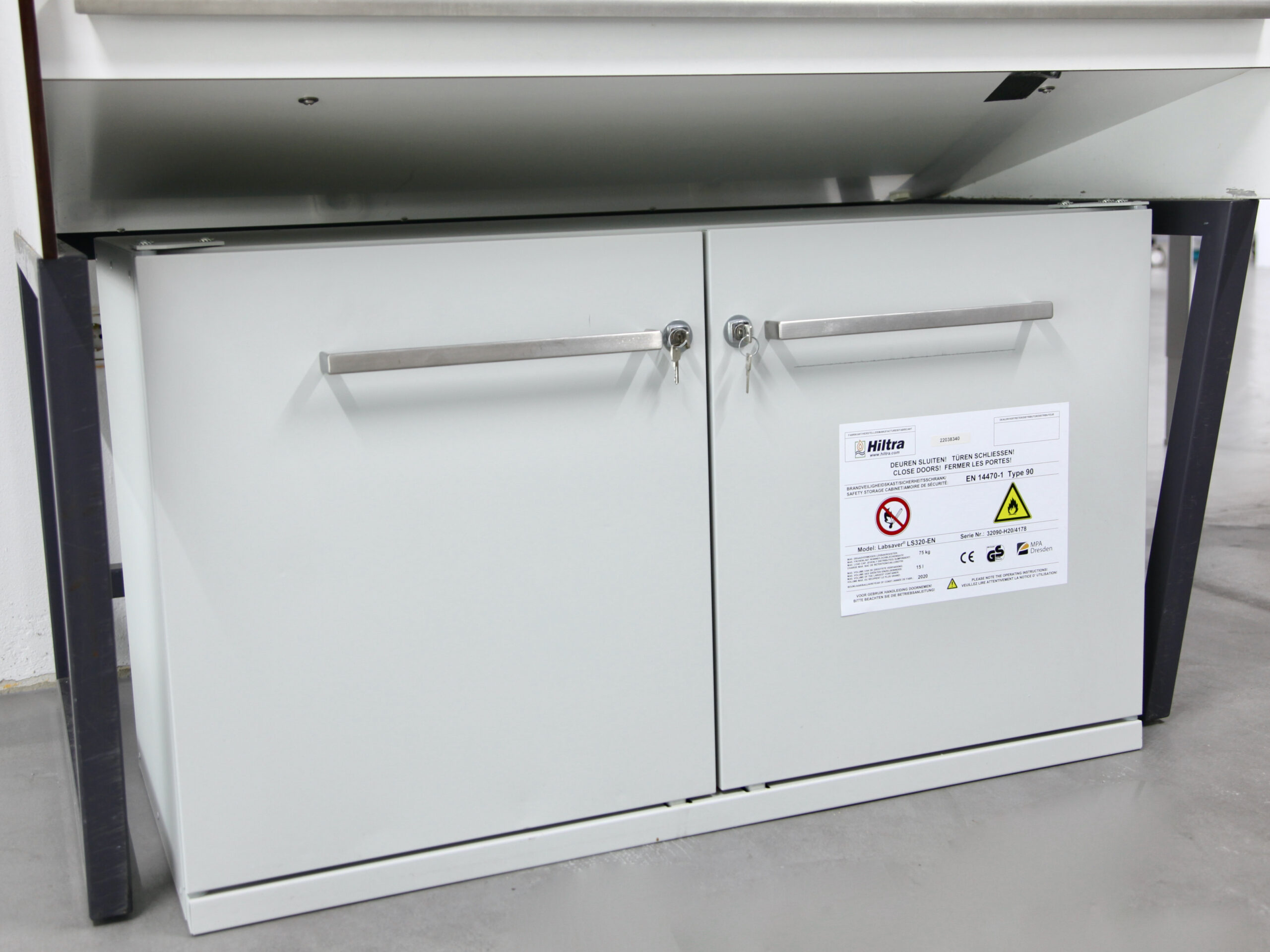 This fire-resistant safety cabinet can easily be placed under a fume hood or lab table. The Labsaver is F90 certified according to EN 14470-1 / EN 14727.