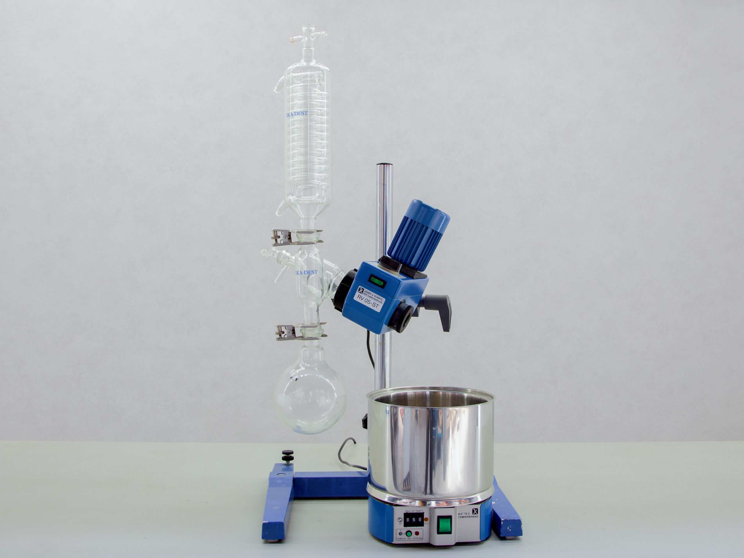 This rotary evaporator from IKA, type RV 05-St, comes with a tripod, glassware and water bath of the brand Tamson, type TE2.