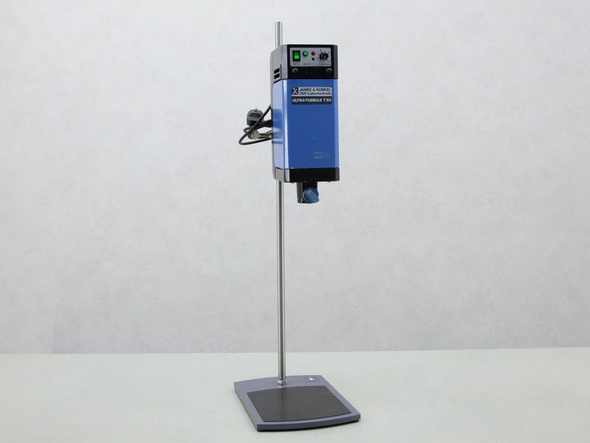 IKA Ultra Turrax type T50 variable speed disperser, height adjustable. The Ultra turrax T50 is a dispersing device which, together with a dispersing tool (shaft), is suitable for making emulsions and dispersions.