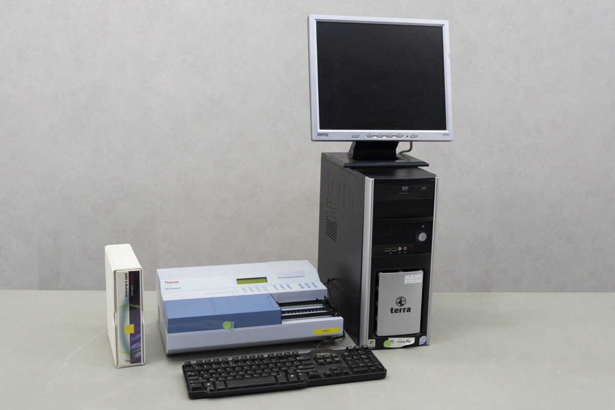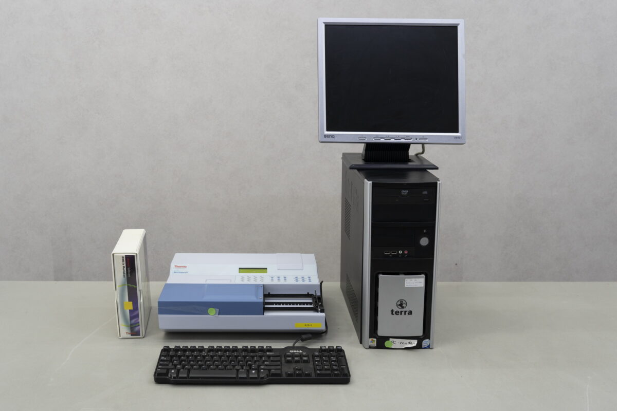 The Multiskan EX355 is a microplate photometer for measuring absorbance from suitable microplates and strips in 96-well plate format. It can be used in research or routine-test laboratories. The Multiskan EX is an eight-channel vertical light path filter photometer. The versatile onboard software of Multiskan EX allows end point and kinetic reading modes. The extended memory holds up to 64 assay protocols.