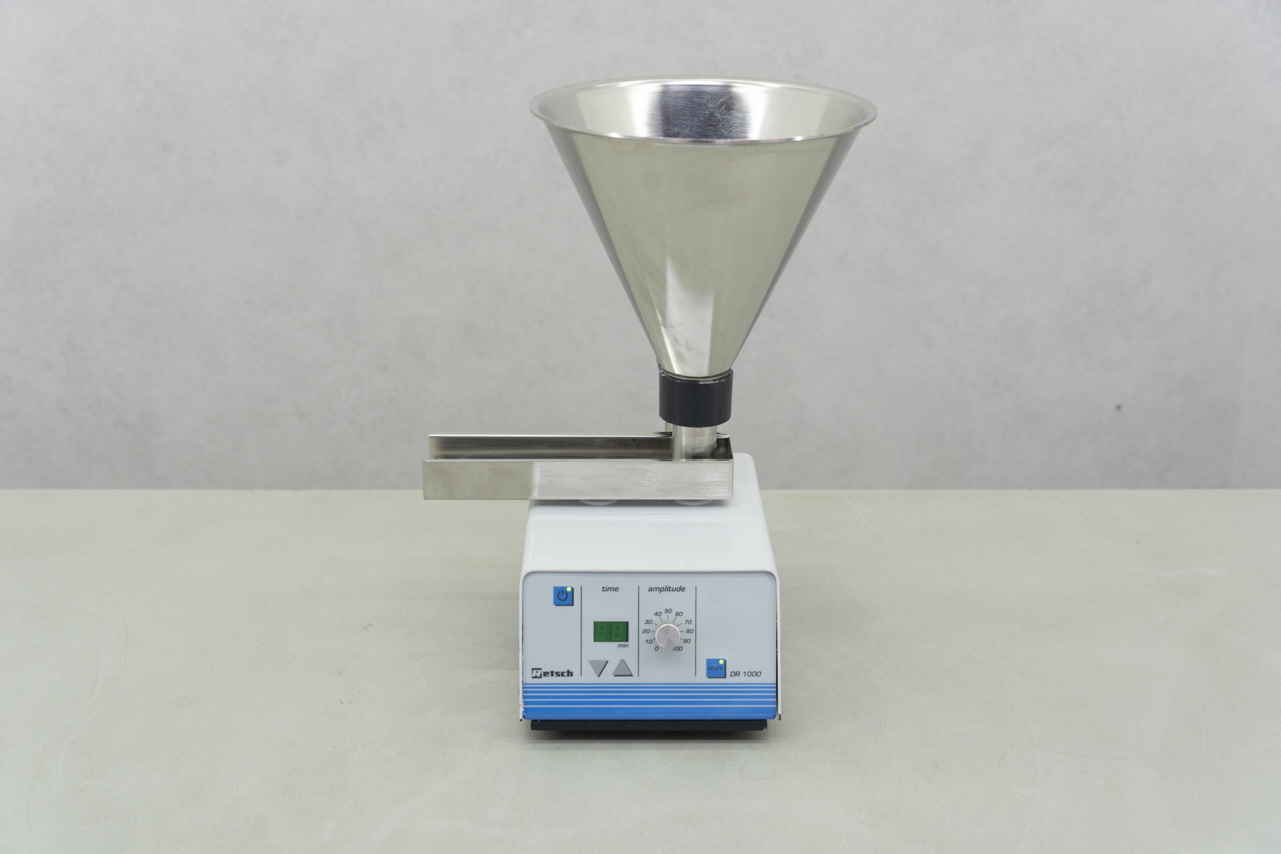 This Retsch DR1000 vibrating feeder is used for the uniform, continuous material supply and transport of pourable bulk materials and fine powders. The DR 1000 can also feed mills and sample dividers such as balances, scales and other analysis or measurement instruments. (Includes a funnel)