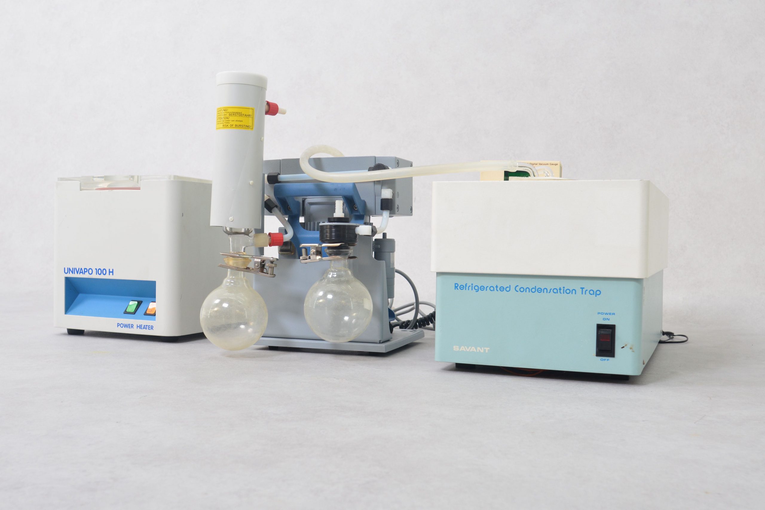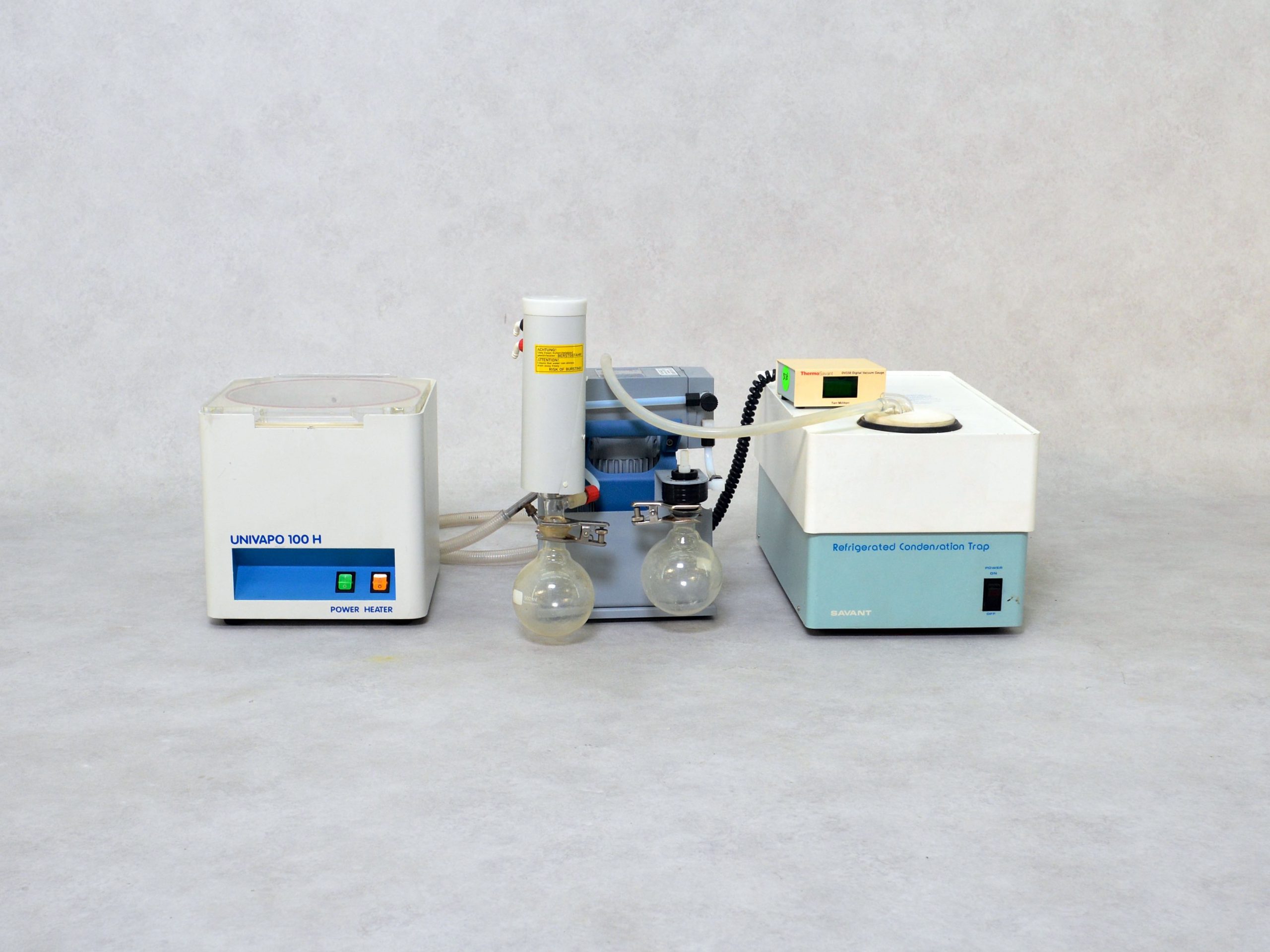 The Refrigerated Vapor Trap uses mechanical cooling to freeze and remove contaminants before they reach the pump. The Savant/ UniEquip Univapo 100H vacuum centrifuge rapid evaporation and solidification of biological solutions in microtubes by centrifugal force in vacuum. In addition, the container of the Refrigerated Vapor Trap is equipped with stainless steel material.