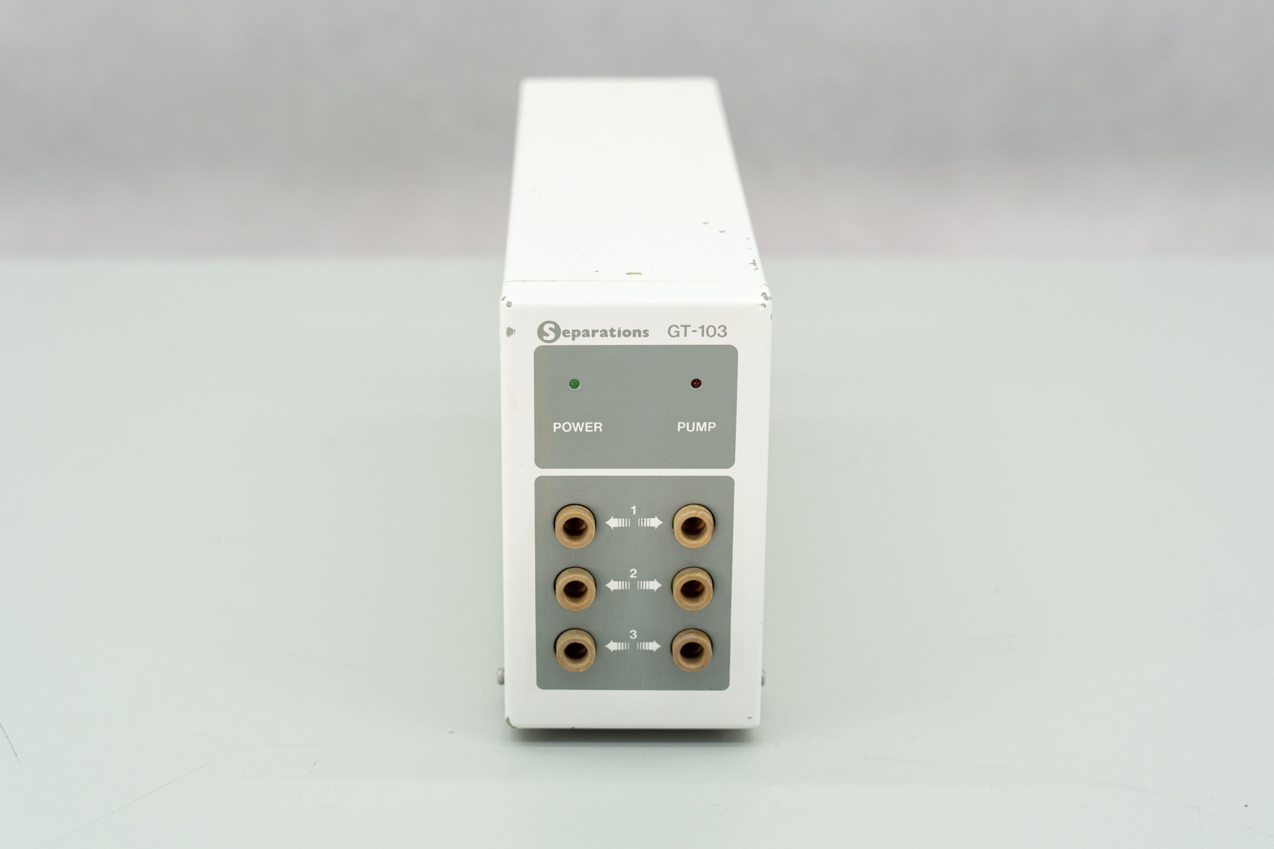Degasser from Separations, type GT-103 with 3 channels, removes gaseous components from a solvent by passing the solvent through a membrane tube, reducing the pressure outside the tube. Removing dissolved gases eliminates bubbles before they form and removes oxygen that can interfere with UV detection methods.
