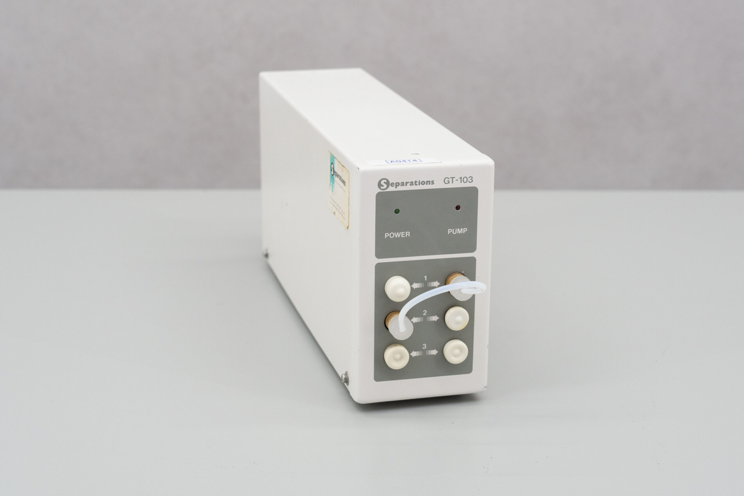 Degasser from Separations, type GT-103 Removes gaseous components from a solvent by passing the solvent through a membrane tube, reducing the pressure outside the tube.