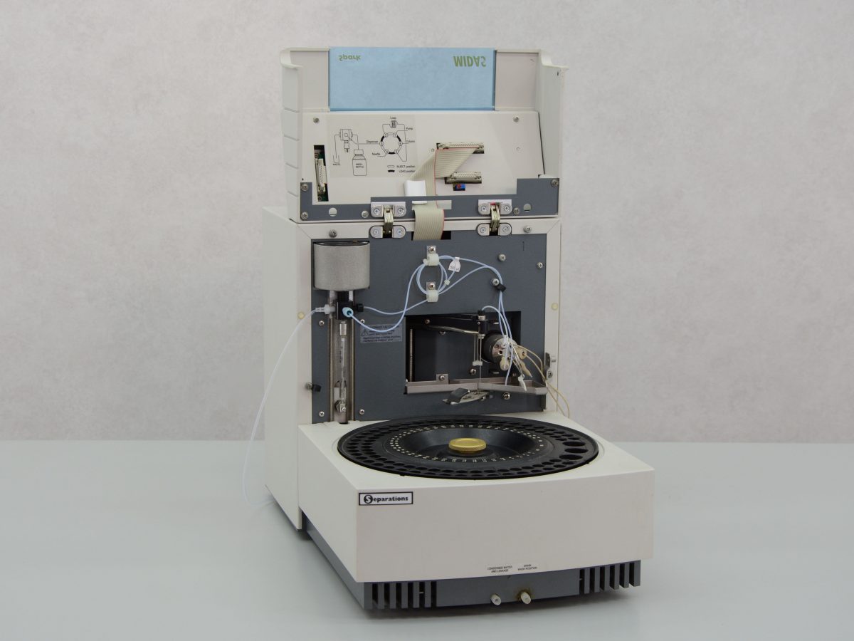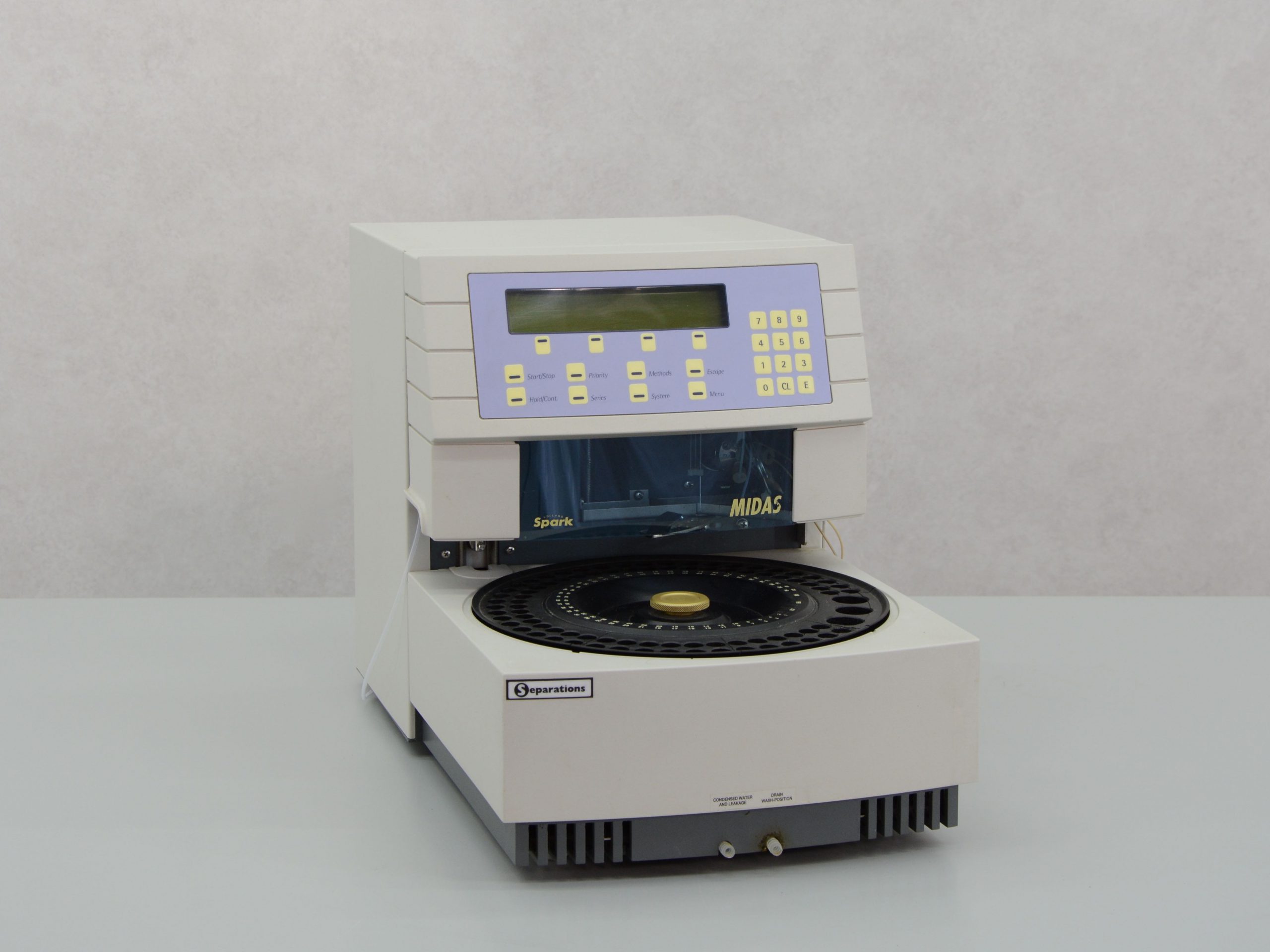 The HPLC sampler of the brand Spark Holland type Midas 830 is an automated device designed to load samples quickly and accurately on a liquid chromatograph to analyze the sample. The sample is separated into components, identified and quantified. The HPLC autosampler is especially useful in laboratories that analyze very small samples or perform large numbers of analyzes. For example, HPLC autosamplers increase the speed and accuracy of sample loading. In addition, this sampler accommodates 83 samples.