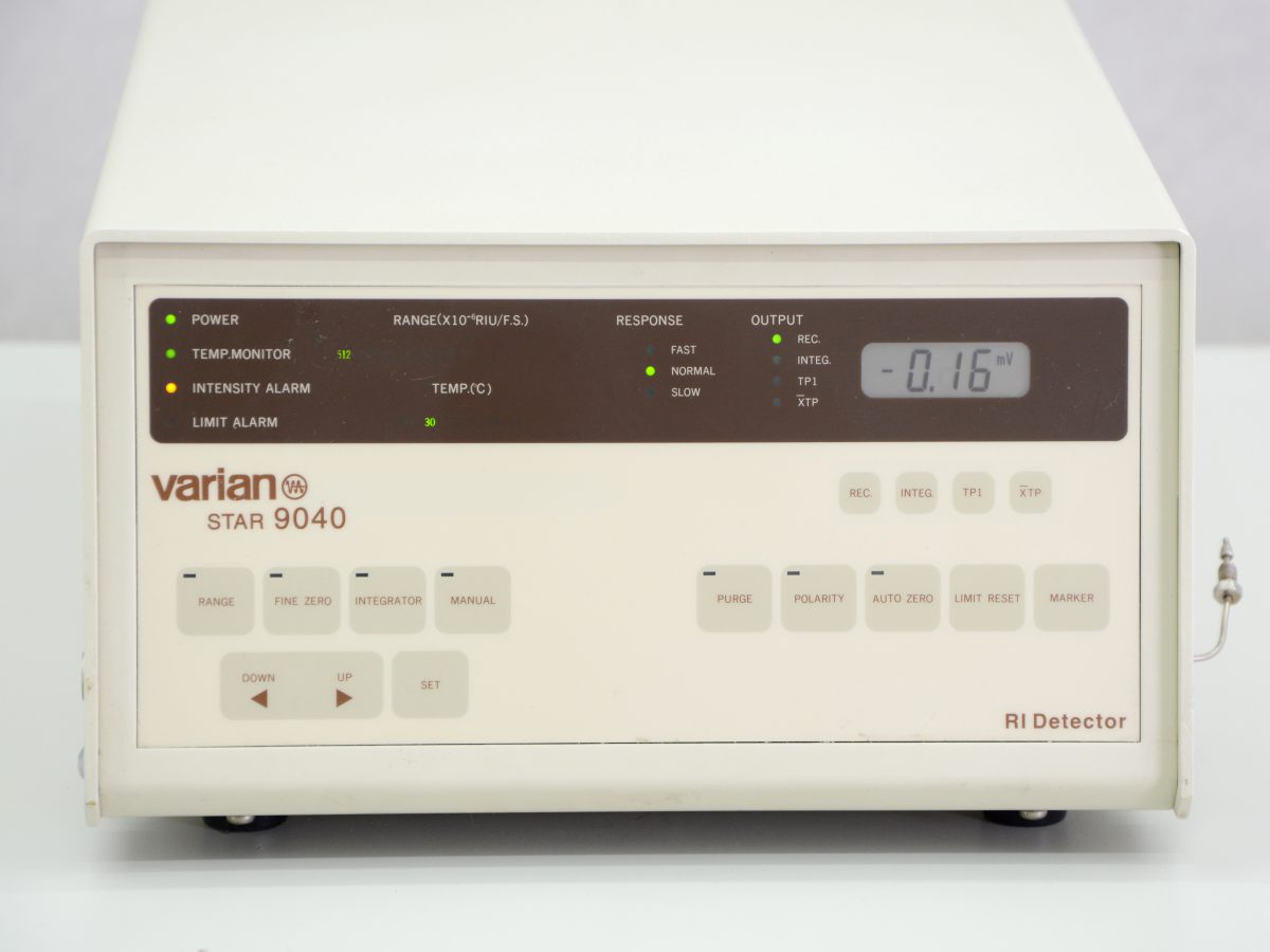 The refractive index detector of the brand Varian type Star 9040 is used in combination with high pressure liquid chromatographs to detect substances with limited or no UV absorption. The Varian Star 9040 is ideal for detecting, among other things, alcohols, sugars, fatty acids, polymers and carbohydrates.